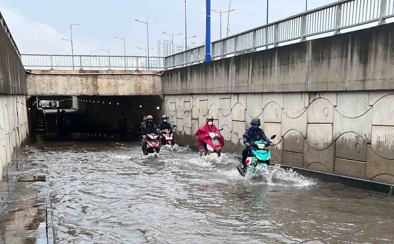 Underpass worth over 70 billion VND in Ho Chi Minh City flooded after heavy rain, a series of vehicles wade through water