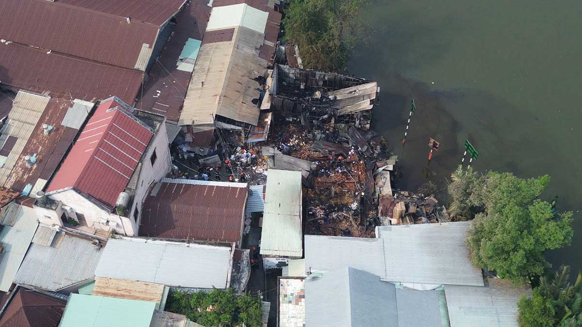Scene of the fire at a row of houses in the riverside area at Binh Trung market