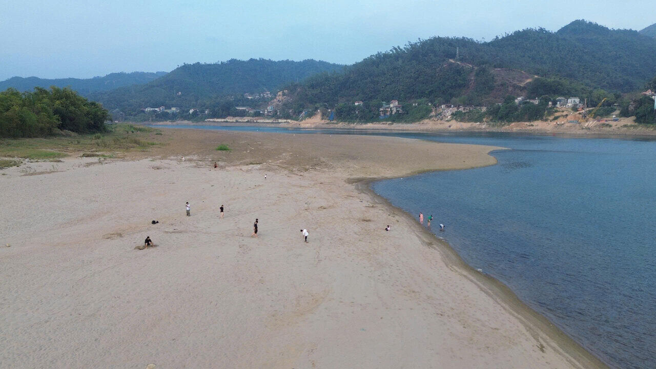 The water level of the Da River downstream of Hoa Binh Hydropower Plant is low, revealing many sandbanks and gravel in the middle of the river, people can wade through the water or walk quite far into the middle of the stream.