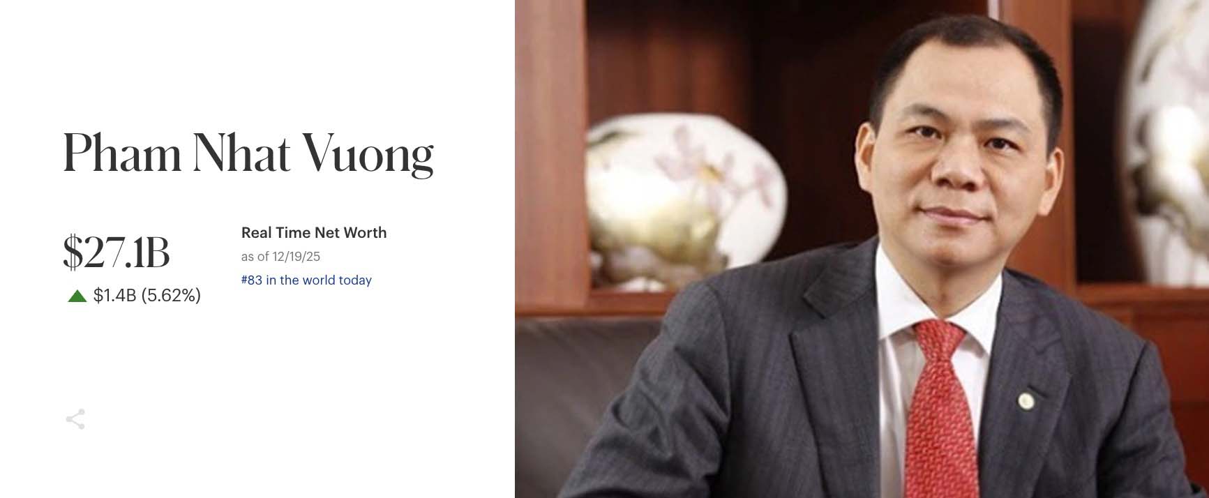 The assets of many Vietnamese billionaires are increasing sharply according to the latest update of Forbes on December 19, in which Mr. Pham Nhat Vuong rose to 83rd place in the world.