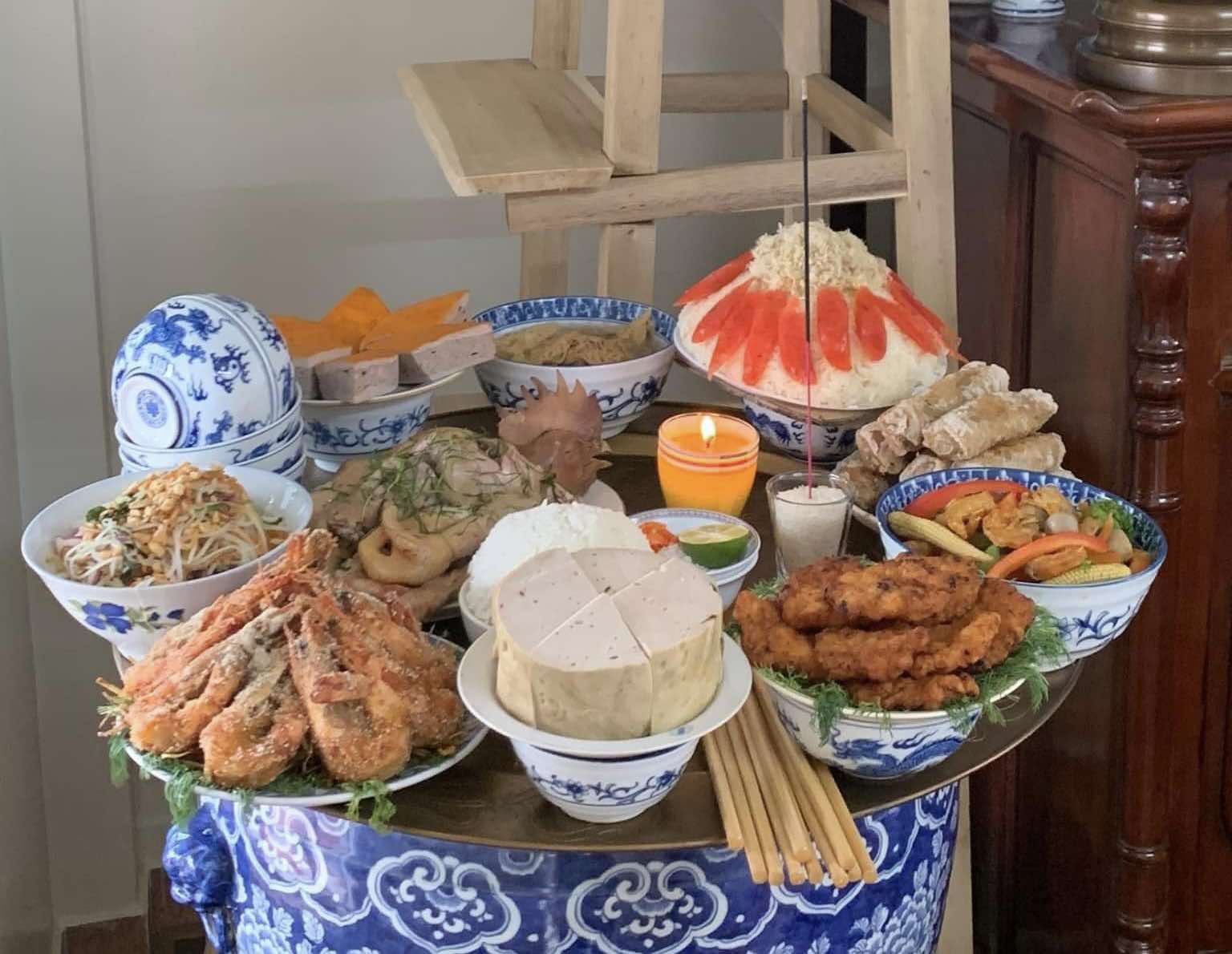 Full and detailed offering tray for worshiping Ong Cong and Ong Tao in 2026