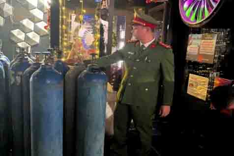 Hanoi - Inspecting two disguised karaoke establishments, authorities discovered dozens of metal cylinders containing N2O gas (laughing gas) used to fill balloons for sale to customers.