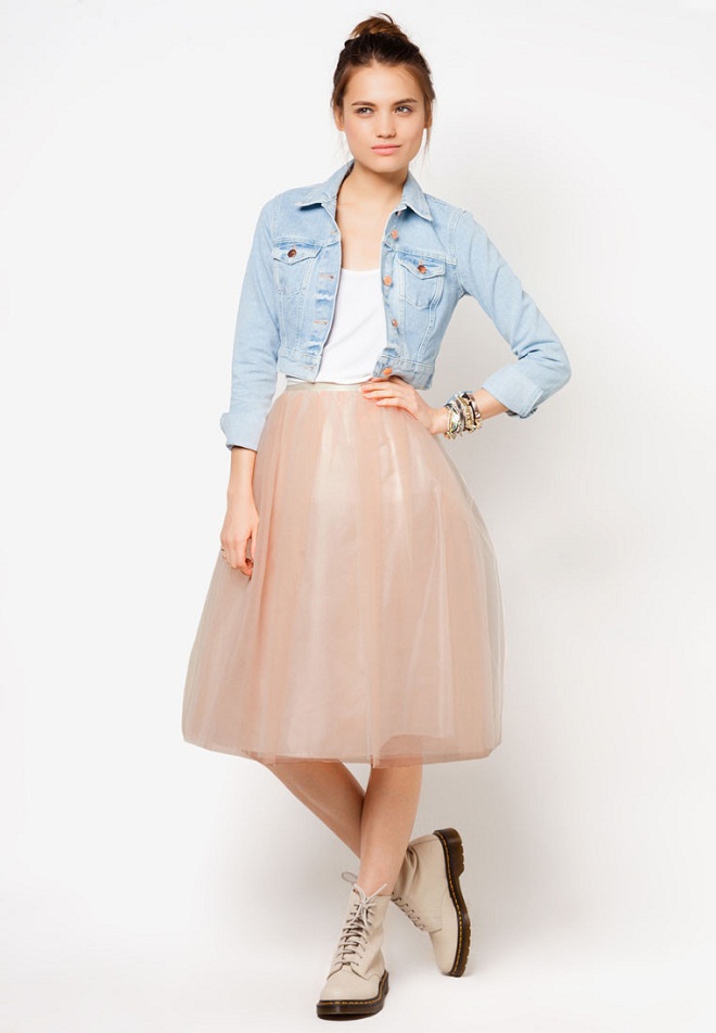 Đầu tiên là những chiếc chân váy midi dáng xòe rộng. Lấy cảm hứng từ bộ trang phục “New Look” của nhà thiết kế Christian Dior, chiếc váy midi dáng xòe ngày nay khá thịnh hành đối với các bạn nữ vì nó mang lại sự thanh lịch và sang trọng cho người mặc. Hơn thế nữa, nó còn có thể giúp khắc phục nhược điểm của người có đôi chân to nhờ tùng váy rộng và độ dài qua đầu gối giúp che phủ được đôi chân của bạn. Nếu bạn còn đang lăn tăn không biết kết hợp chiếc váy này với item nào thì chiếc áo crop top sẽ là một gợi ý khá hay.