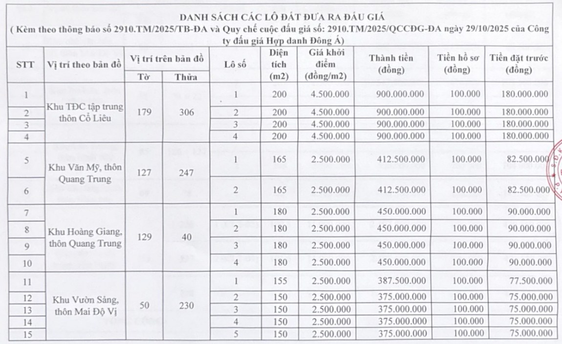 The time for selling and receiving documents to participate in the auction takes place from 8:00 a.m. on October 30, 2025 to 5:00 p.m. on November 12, 2025 (during office hours, excluding holidays and public holidays) at three locations: Dong A Joint Stock Auction Company; Ninh Binh Branch of the company and People's Committee of Tan Minh commune (Ngoc Che village, Tan Minh commune, Ninh Binh province).