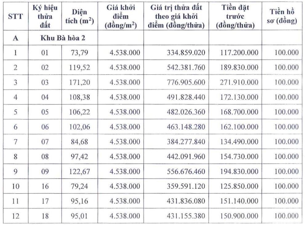 According to the announcement, the land plots put up for auction have an area from 73.79 to 180m2. The starting price is divided into two levels, of which 32 land plots in Ba Hoa 2 area have a starting price of 4,538,000 VND/m2, and 2 land plots in Van Diem area have a starting price of 12,053,000 VND/m2.