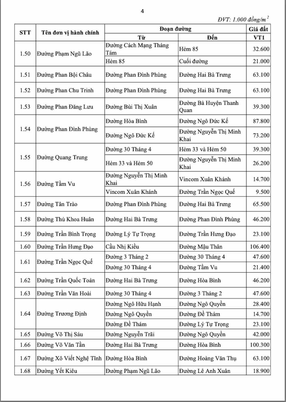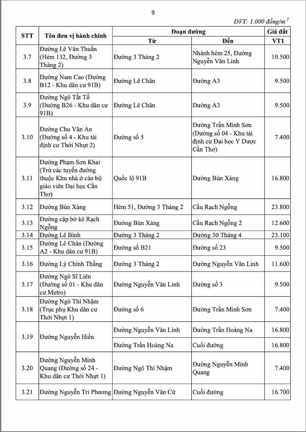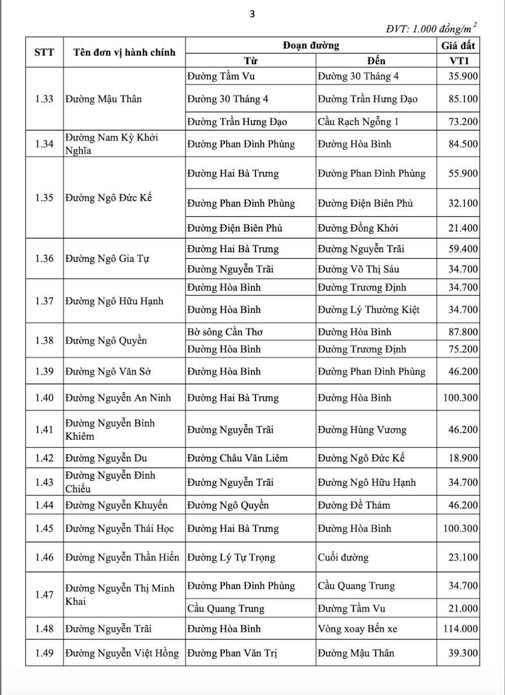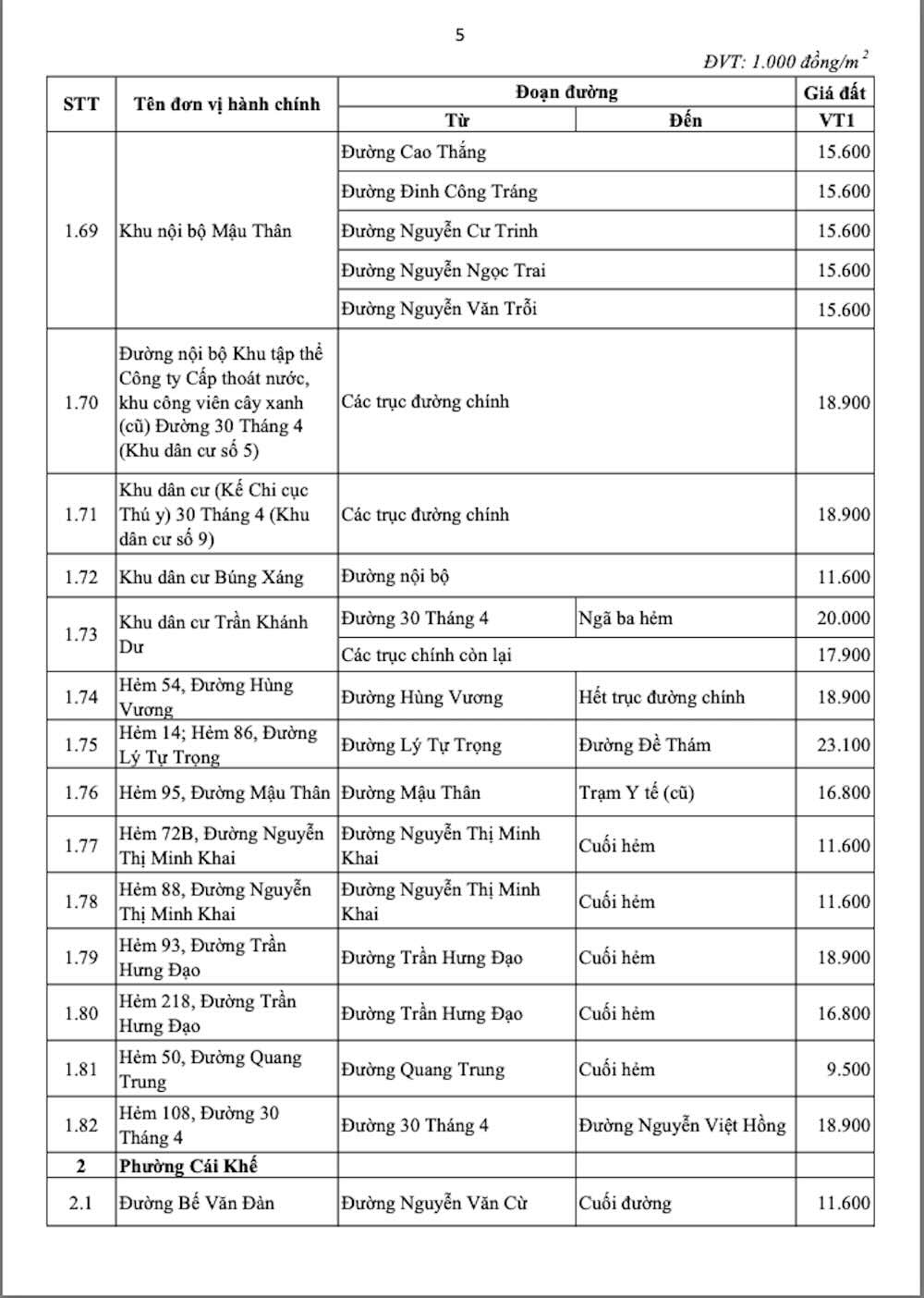 Those are Hoa Binh streets (from Nguyen Trai street to 30 Thang 4 street) priced at 177.8 million VND/m2; Nguyen Trai street (from Hoa Binh street to Ben xe roundabout) priced at 114 million VND/m2; Ly Tu Trong street (from Tran Hung Dao street to Can Tho University Zone III - Truong Dinh street) priced at 109.4 million VND/m2; Hai Ba Trung street (from Ninh Kieu restaurant to Nguyen An Ninh street) priced at 100.3 million VND/m2;...