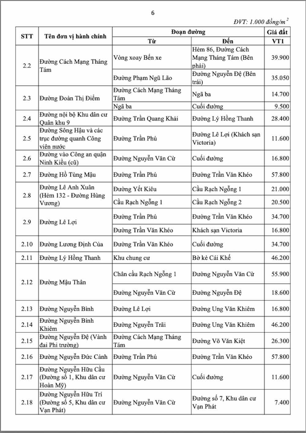Lao Dong Newspaper updates to readers the urban residential land price list in Ninh Kieu, Cai Khe, Tan An wards.