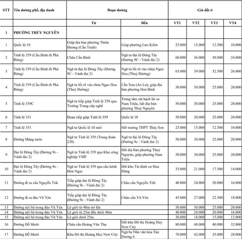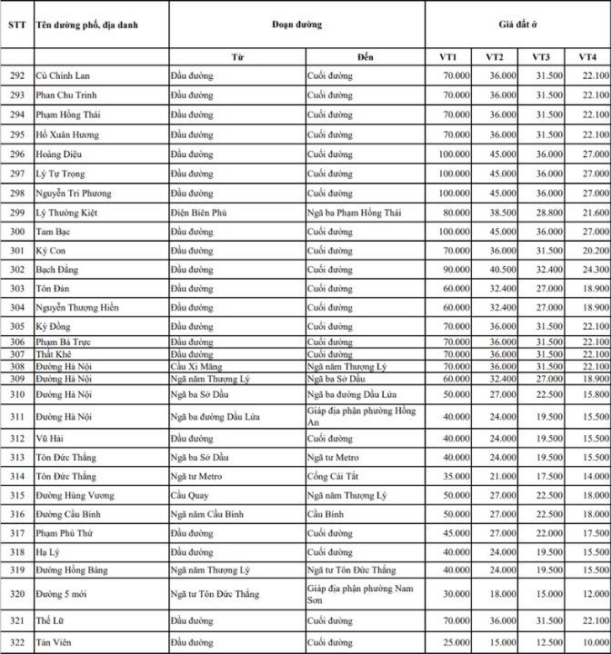 Details of the land price list of Hai Phong City in 2026 for some areas are as follows: