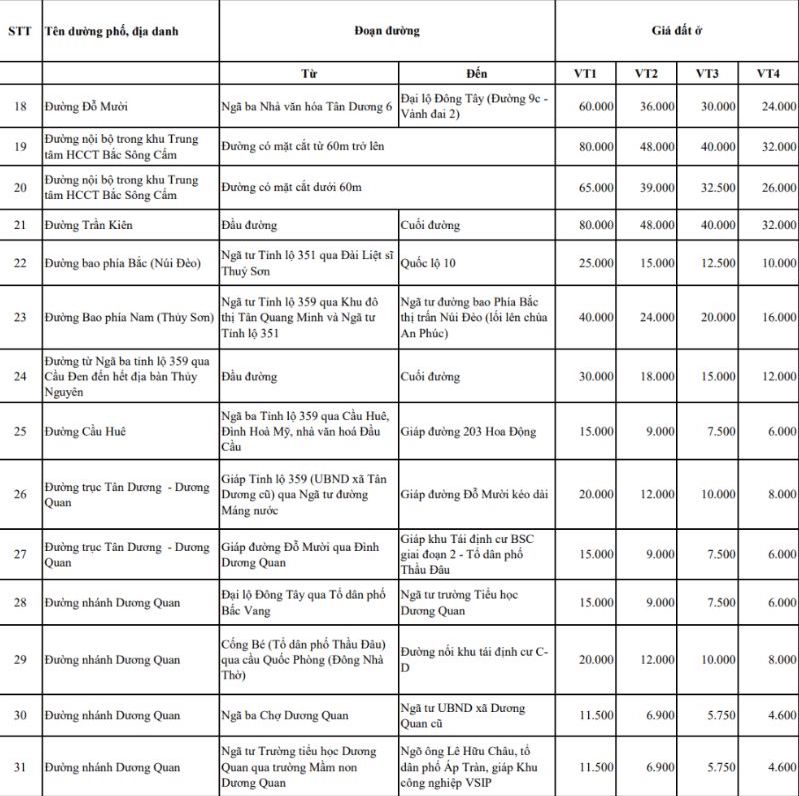 Accordingly, Resolution No. 85/NQ-HDND includes 4 Appendices: Appendix I - Agricultural land price list; Appendix II - Price list of residential land, commercial service land, non-agricultural production land, land used for mineral activities in rural areas; Appendix III - Price list of residential land, commercial service land, non-agricultural production land, land used for mineral activities in urban areas; Appendix IV - Price list of industrial park and industrial cluster land.