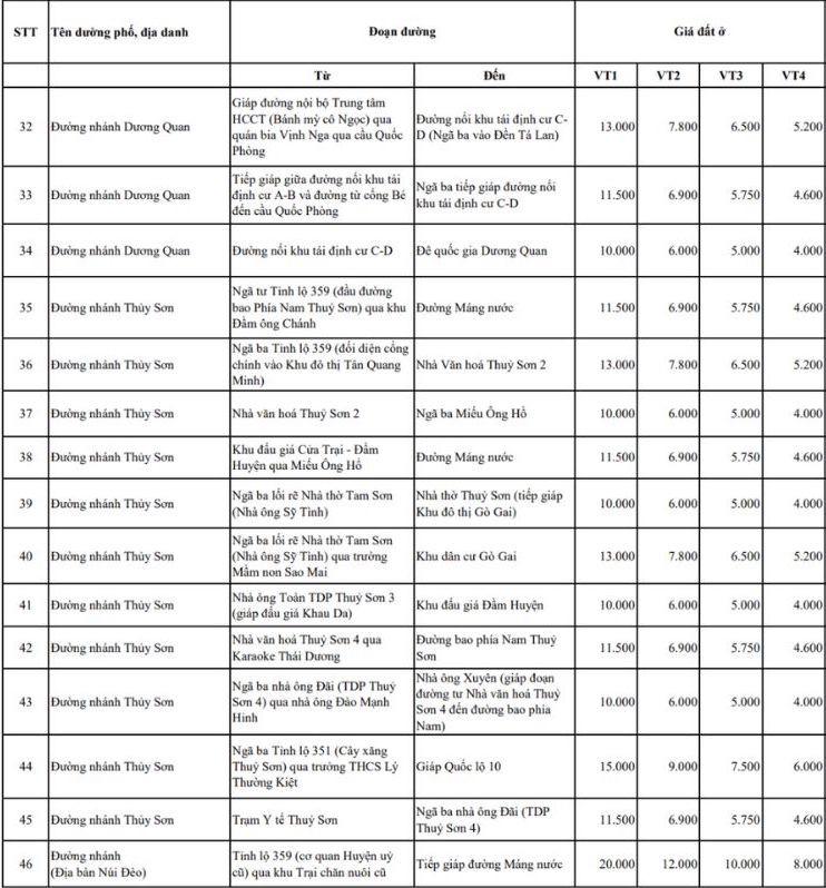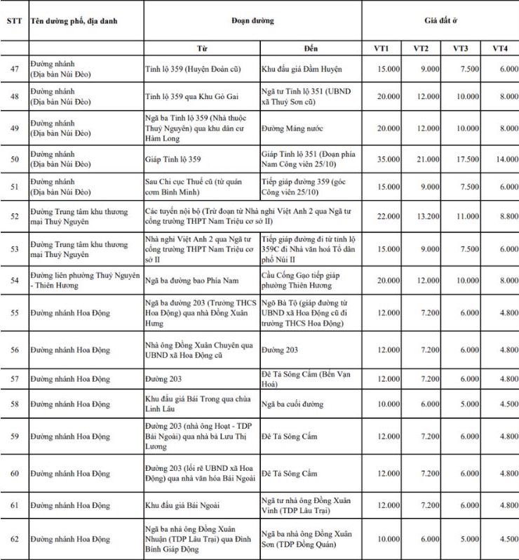 The road with the lowest land price (VT1) (except Bach Long Vy Special Zone) is located on the main roads of Chin Thuong Residential Group; Trai Sat (in Nguyen Trai Ward) with a price of 2 million VND/m2.