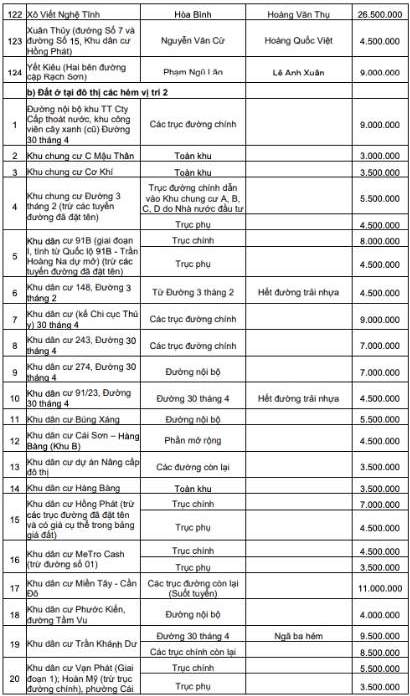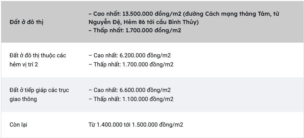 In Cai Rang ward, which is merged by 4 wards: Le Binh ward, Thuong Thanh ward, Ba Lang ward, Hung Thanh ward, the price of residential land ranges from 650,000 - 10 million VND/m2 depending on location.