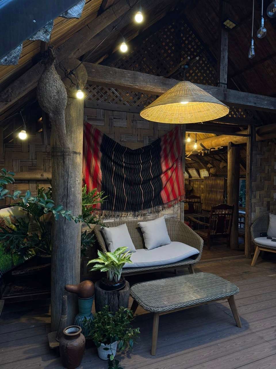The stilt house of H'Hen Nie and her family along the garden becomes the main axis connecting the living spaces: in front is the dinner yard, on one side is a relaxing corner, behind is the vegetable, mushroom and bamboo shoots. Every detail such as the set of cloud and chair tables, brocade fabric, mortar, bamboo basket... is used to create a rustic yet clearly aesthetic look.