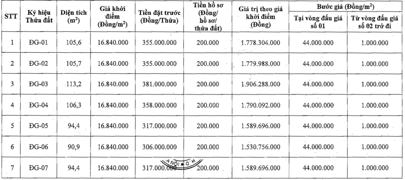 The total area of land plots put up for auction is 1,341 m2, the area of each plot ranges from 81.7 m2 to 164.2 m2. The starting price is determined to be 16,840,000 VND/m2.