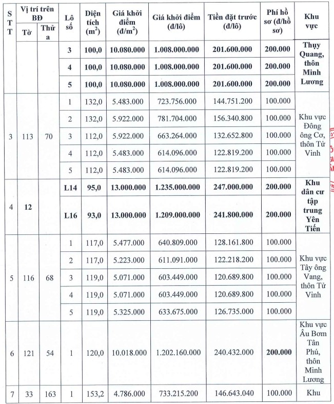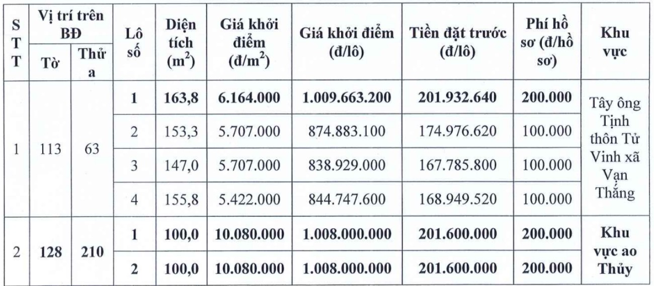 The auction documents will be sold and received from November 4 to November 17, 2025 during office hours at the headquarters of Xuan Truong Auction Joint Stock Company (Xuan Truong commune, Ninh Binh province) and the People's Committee of Van Thang commune (headquarters of the People's Committee of the old Yen Tien commune). The sale and receipt of documents are carried out on both Saturday and Sunday. People can submit their application directly at one of the above two locations.