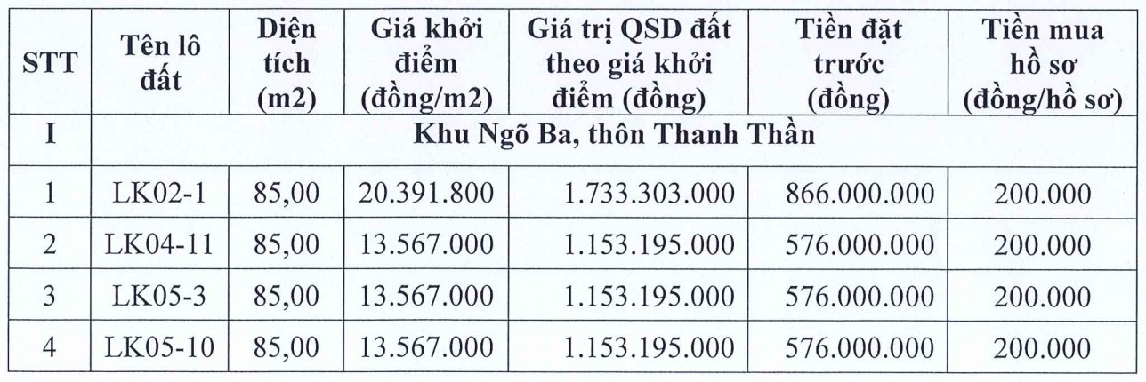 The auction is expected to be held at 8:30 am on March 21, 2026 at the Binh Minh Commune Party Committee Hall (former Thanh Cao Commune People's Committee headquarters), No. 286 Thanh Than village, Binh Minh commune, Hanoi city.