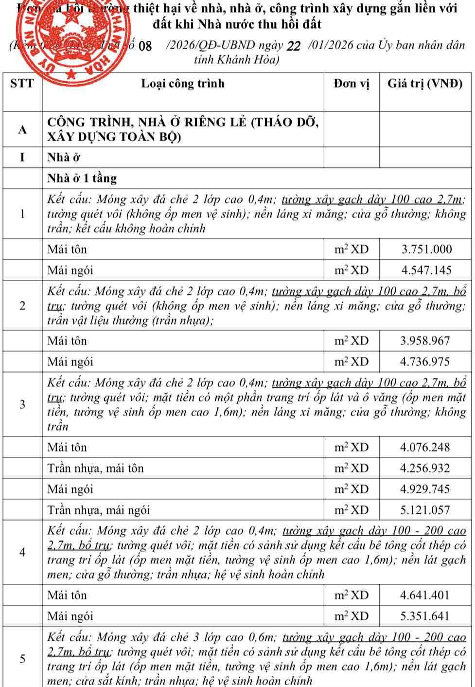 On January 31, the Office of the People's Committee of Khanh Hoa province said that the locality has issued a decision stipulating the unit price for compensation for damage to houses, houses, and construction works attached to land when the State recovers land; the level of support for dismantling, demolition, and relocation of construction works according to a term construction permit in the province.