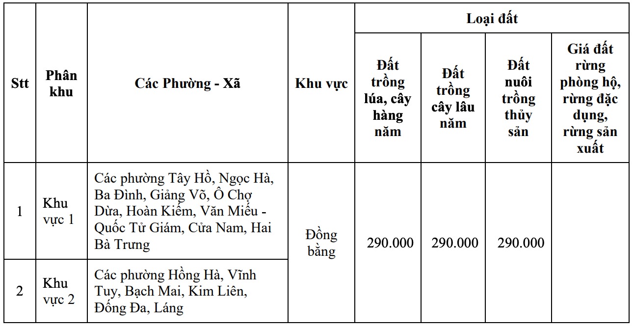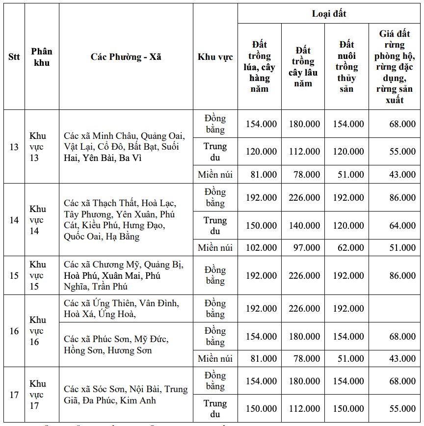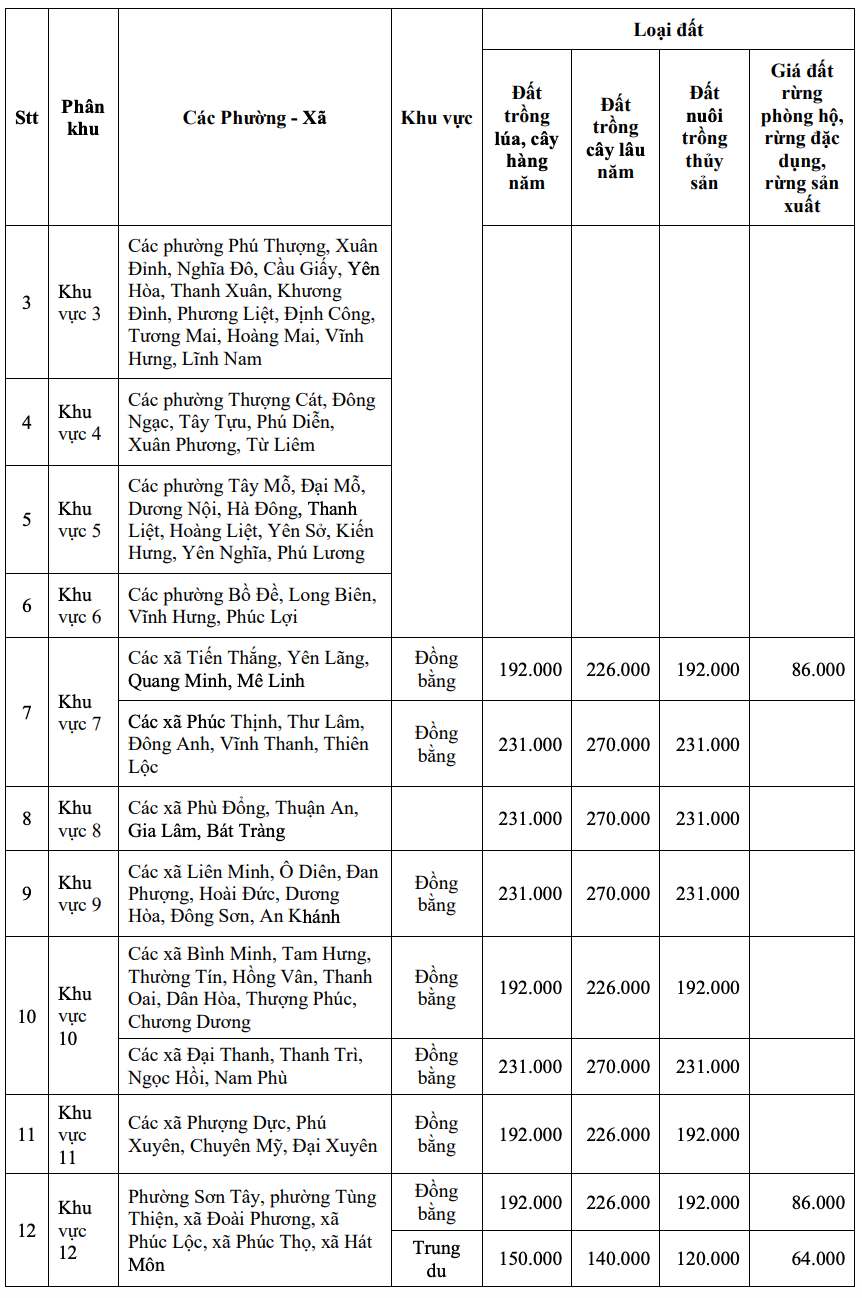 For the remaining part of Area 7, Area 8 and the remaining part of Area 10, which are the communes of Hoai Duc, Dan Phuong, Dong Anh, Gia Lam, Thanh Tri districts before the merger: There is a plan to become a district in 2025. Due to economic conditions, infrastructure is better than in other areas. Proposal, agricultural land price is equal to agricultural price of area 9 (Hoai Duc district, Dan Phuong before the merger).
