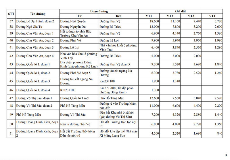 According to the residential land price list in Dong Kinh urban area, Lang Son issued together with Resolution No. 48/2025/NQ-HDND dated December 10, 2025 of the People's Council of Lang Son province, the land price is detailed according to each route, each section and divided according to 4 locations (VT1 to VT4).