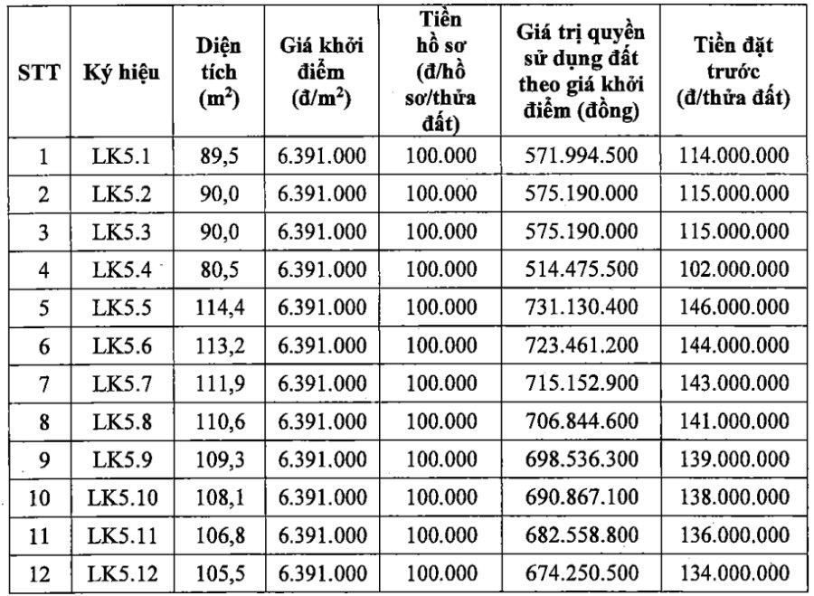 Land plots put up for auction have an area from 80.5 to 111.9m2. The starting price at the first auction round is 6,391,000 VND/m2. From auction round No. 2 onwards, the starting price of the next round is the highest valid payment price of the previous adjacent auction round. In case the highest valid payment price in the previous round is equal to the starting price, the starting price of the next round is determined by the starting price of the previous round plus one price step.