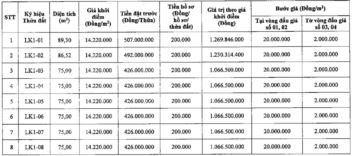 The total area of land plots put up for auction is 1,455.59m2, with a starting price of 14,220,000 VND/m2. The auction form is direct voting in multiple rounds at the auction session, at least 2 mandatory rounds and a maximum of 4 rounds; upward bidding method.