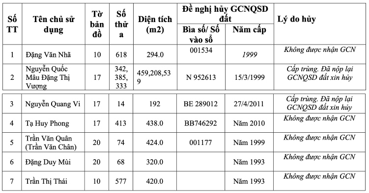 Me Linh Commune People's Committee has just issued a decision on the revocation and cancellation of land use right certificates issued to 7 households and individuals that are not in accordance with regulations (dumping) in Me Linh commune according to Conclusion No. 139/KL-UBND dated July 20, 2012 of Me Linh District People's Committee.