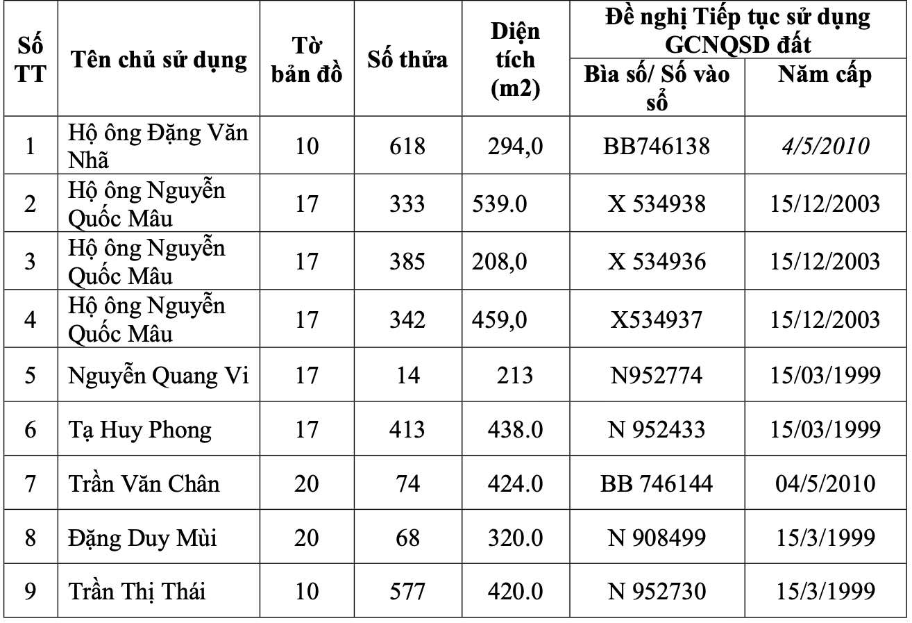 Me Linh Commune People's Committee allows households and individuals to continue to use and manage specific land use right certificates as follows:
