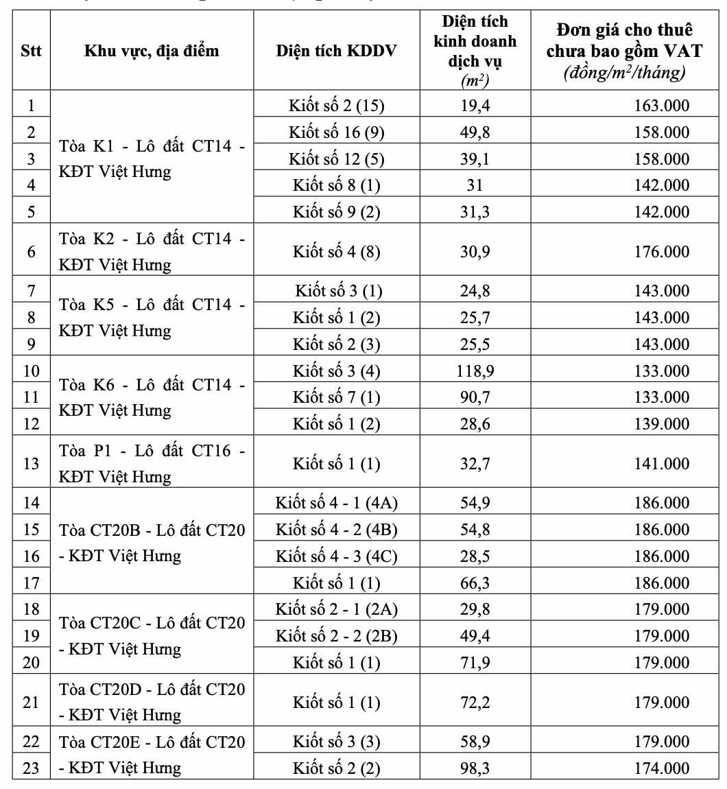 According to the decision, the unit price for leasing business service areas of 9 commercial apartment buildings in Viet Hung Urban Area, which are public assets of the city, is approved and assigned to the Hanoi City Housing Management Center for management.
