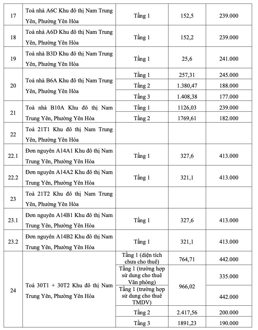 Unit prices for leasing business service areas in resettlement apartment buildings belonging to public assets of the city assigned to the Hanoi City Housing Management Center for management: