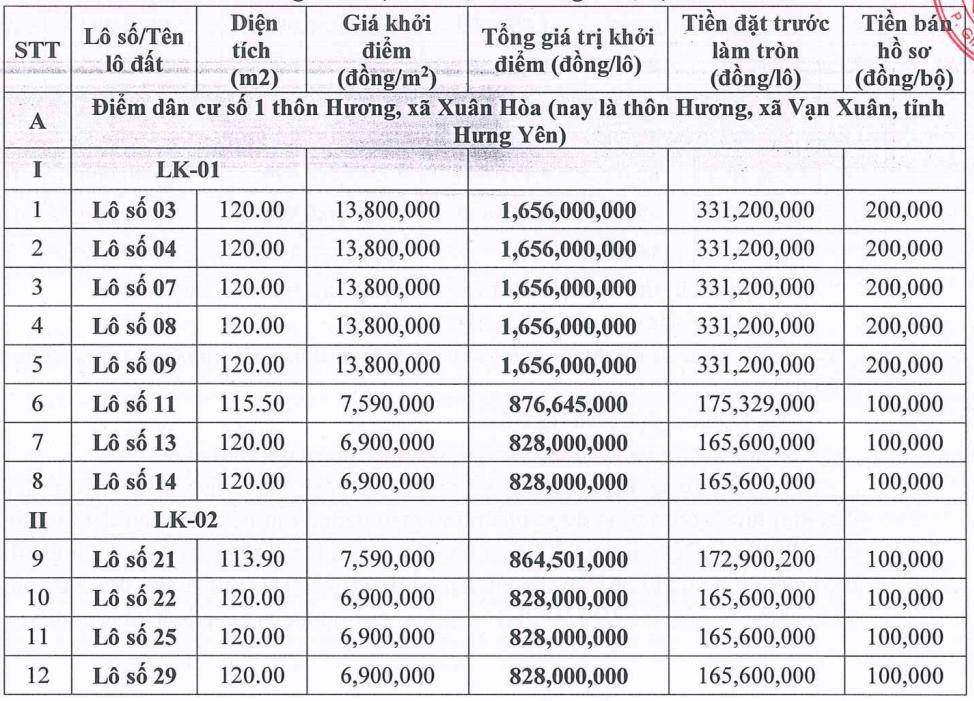 The auction is scheduled to take place at 8:00 a.m. on November 1, 2025 (Saturday) at the Hall of the Party Committee of Van Xuan commune, Hung Yen province (headquarters of Xuan Hoa commune, old Vu Thu district).