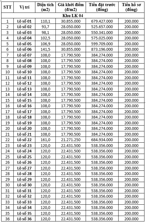 The Hung Yen Province Property Auction Service Center has just announced the organization of an auction of the right to use 64 plots of land in Thanh Mieu residential area (opposite the Health Station), Vu Phuc ward (phase 1).