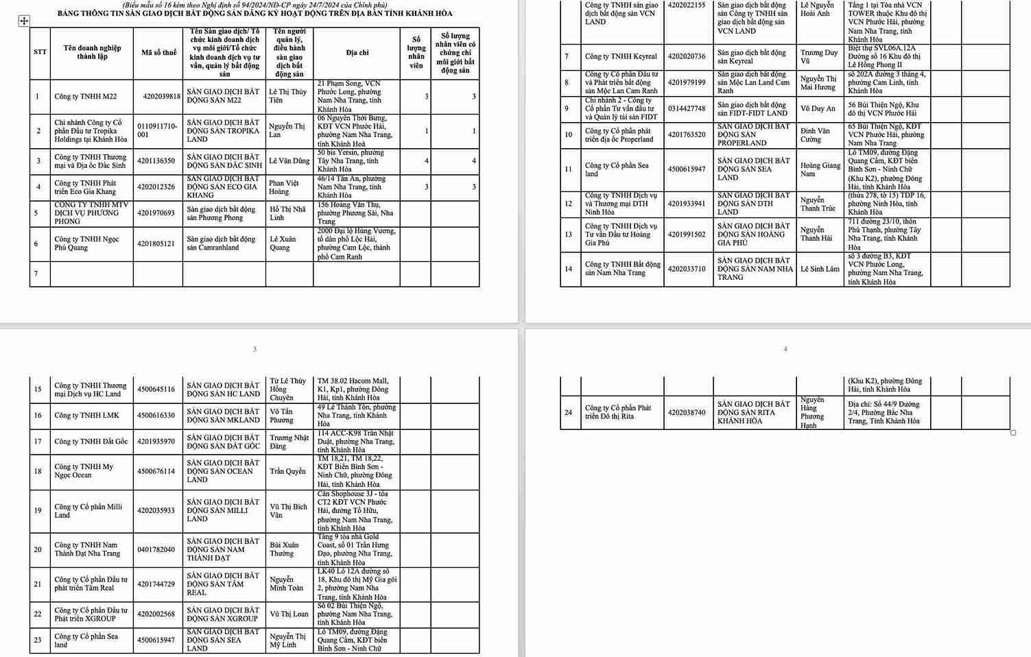 The list of real estate exchanges and real estate brokerage service business organizations registered to operate is periodically updated by the Department of Construction of Khanh Hoa province on this unit's website for people and businesses to supervise together.