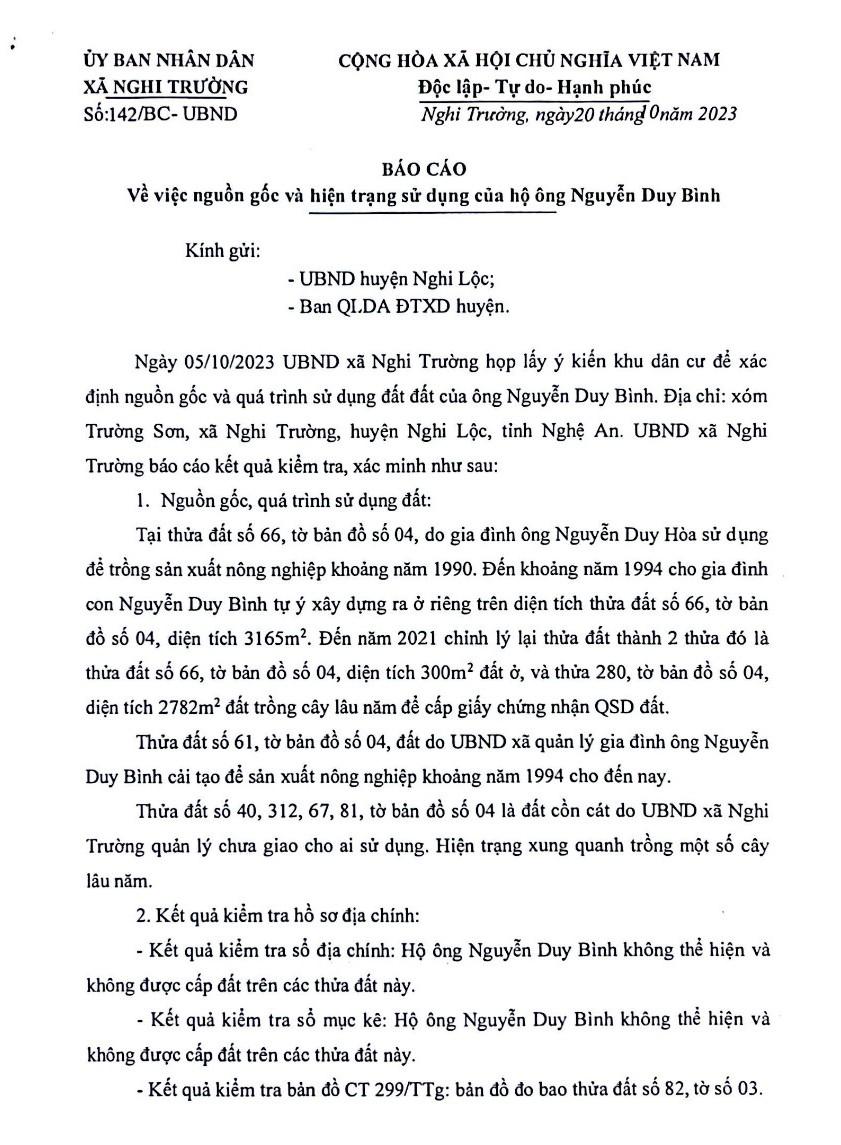 This report also affirms that the entire land plot belongs to sand dune land managed by the Commune People's Committee, has not been allocated to any individual for use; Mr. Nguyen Duy Binh's household is not named in the cadastral book, land register and is not allocated land according to regulations.