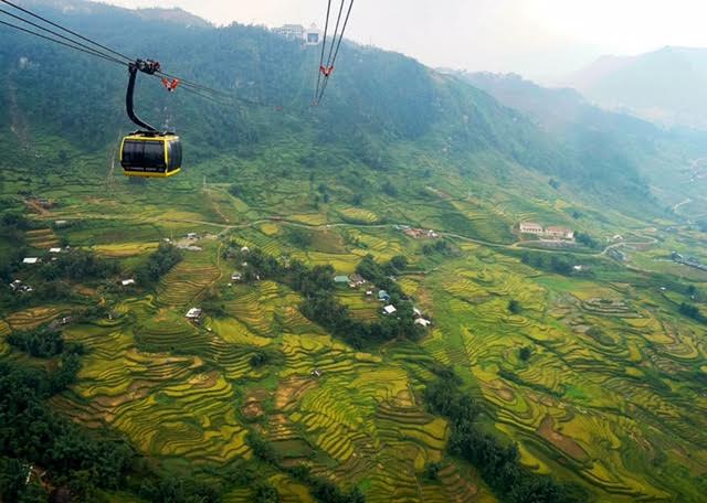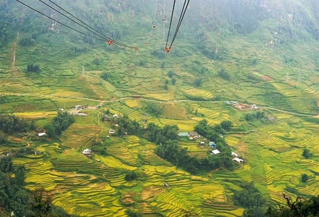 Từ cáp treo nhìn xuống, lớp lớp ruộng bậc thang uốn mềm như hàng ngàn dải lụa vàng đẹp đẽ được đất trời thả xuống nhân gian. Những đường bờ ruộng xanh rì cỏ chạy quanh co theo các tầng, các bậc khác nhau càng khiến bức tranh thiên nhiên hùng vỹ như sâu hơn, sinh động và có hồn hơn bao giờ hết.