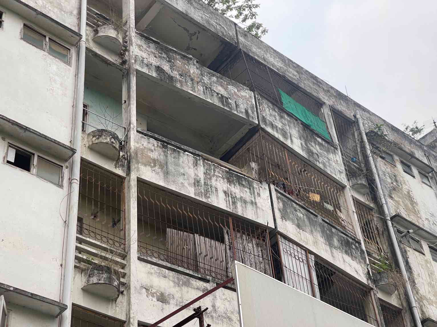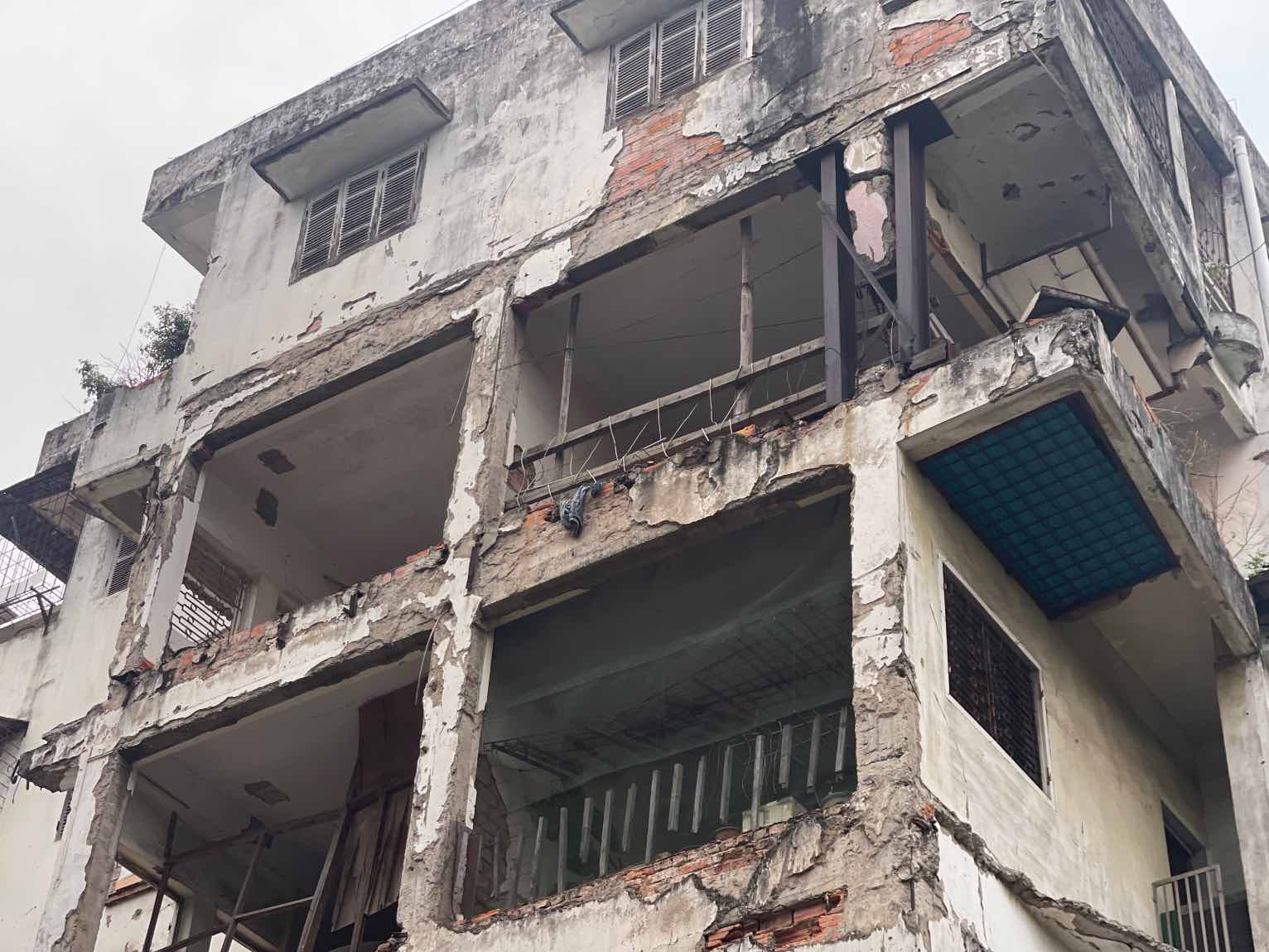 This apartment building is currently seriously degraded. The front part of block 1 collapsed, many concrete pillars are bent and tilted. Through inspection, city functional agencies have determined that the project is classified as class D dangerous house.