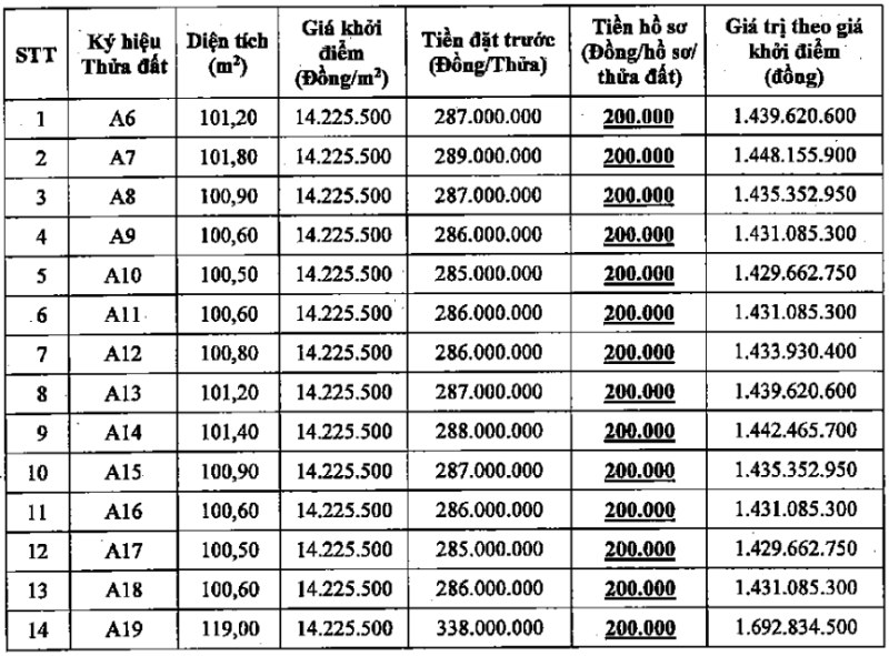 Land plots with areas from 96.6 - 119m2. The starting price includes 2 levels: 9,545,000 VND/m2 and 14,225,500 VND/m2. The price step applied to the land plots and in the auction rounds is 3,000,000 VND/m2.