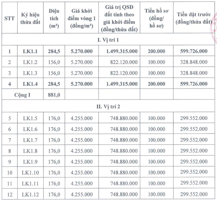 Land plots with areas from 156 - 284.5m2. The starting price includes two levels: 4,255,000 VND/m2 and 5,270,000 VND/m2.