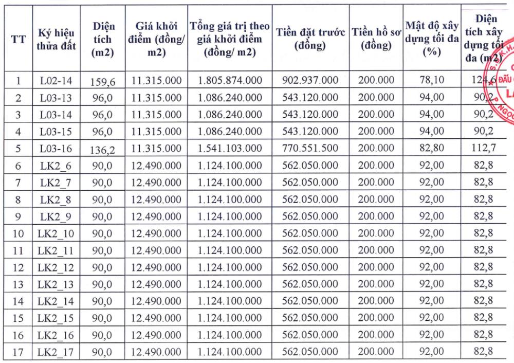 The land plots have an area ranging from 90 - 159.6m2, with two starting prices of 11,315,000 VND/m2 and 12,490,000 VND/m2.