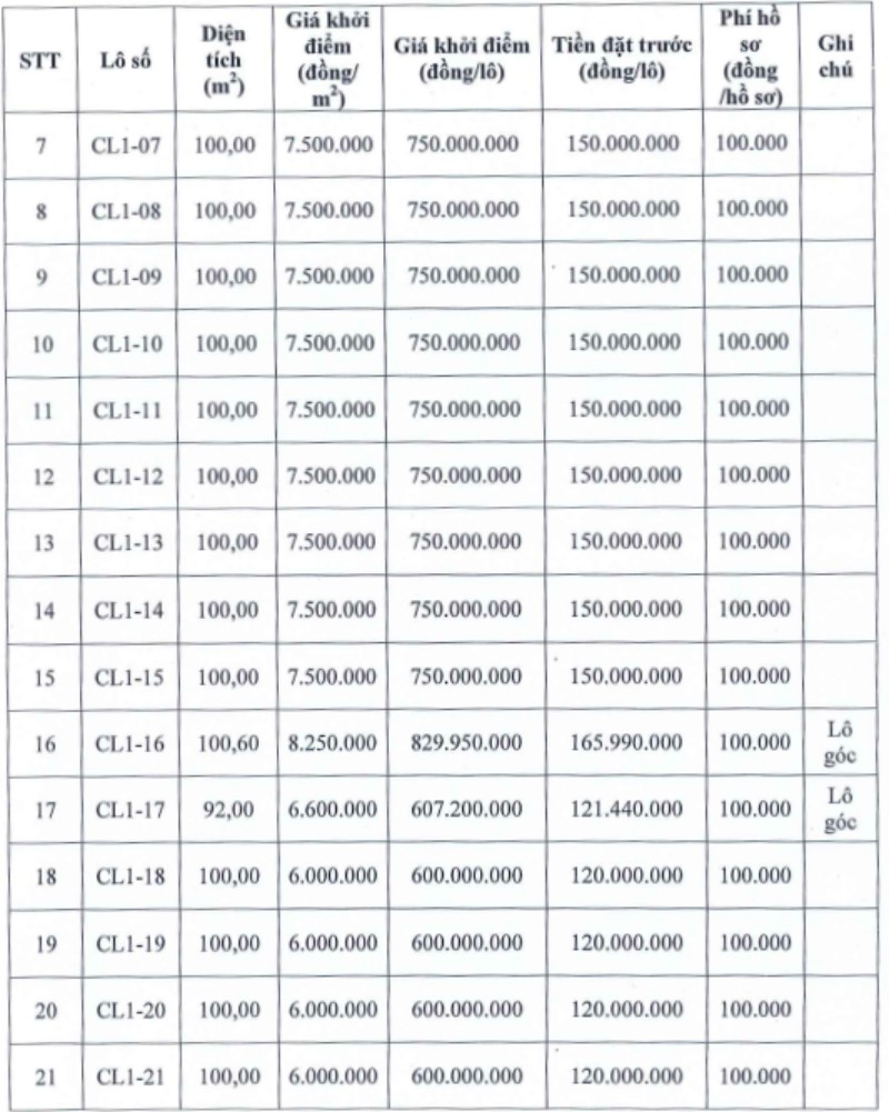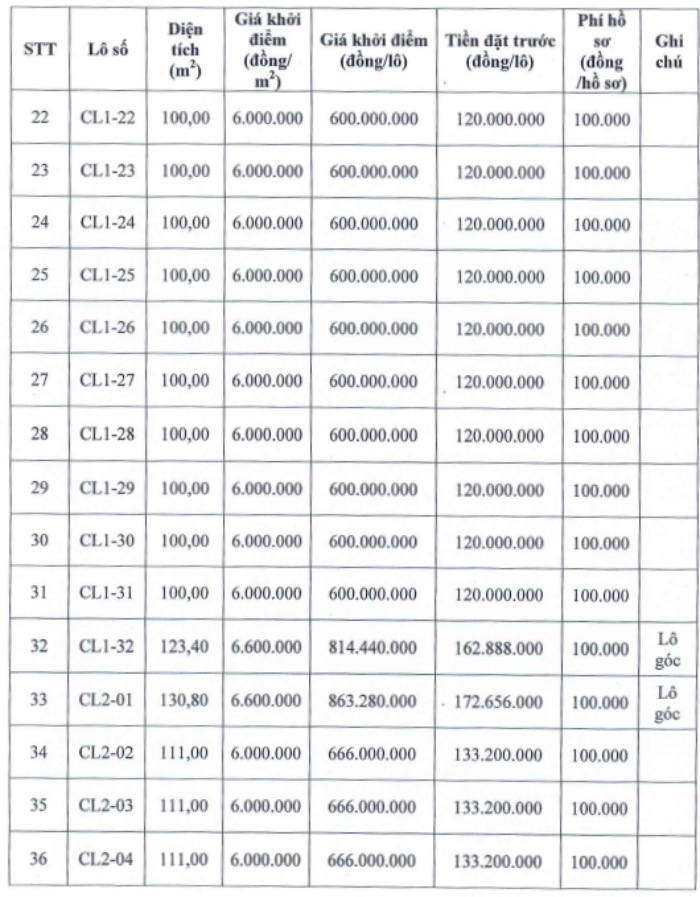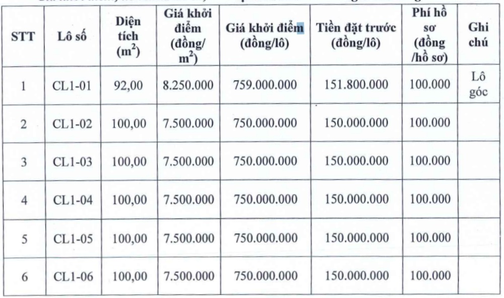 The total area of land put up for auction is 4,337.8m2, including 42 land lots with areas ranging from 92m2 to 130.8m2. The starting price is from 6 - 8.25 million VND/m2, equivalent to about 600 - 863 million VND per plot of land.