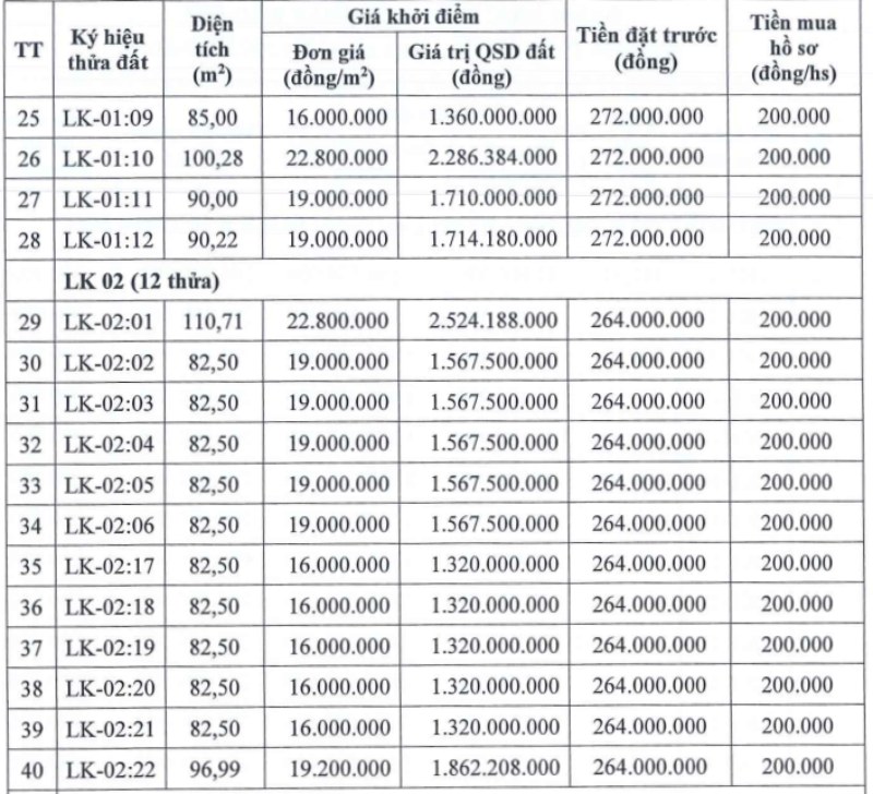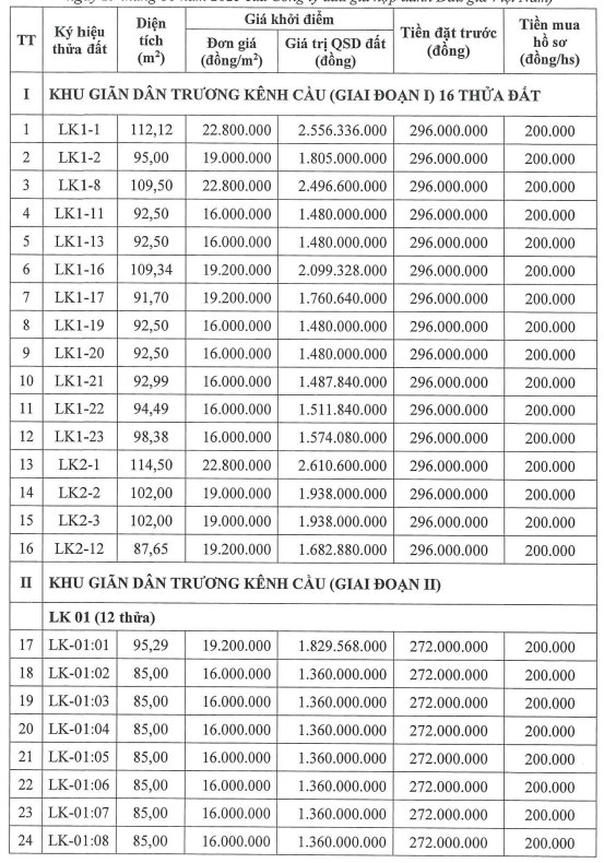 The total area of the auctioned plots is 6,393.8m2, the area of each plot ranges from 82.5m2 to 133.6m2, starting price from 16 to 22.8 million VND/m2.