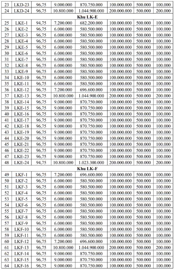 The total area of the land lots is 6,958m2, of which each plot of land has an area of 94.75 - 96.75m2, starting price from 6 - 10.8 million VND/m2.