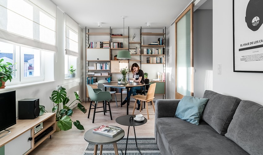 Nhờ biết cách chọn nội thất và tông màu, gia chủ biến căn hộ một phòng ngủ chật hẹp thành không gian sống rộng rãi, gần gũi với thiên nhiên.