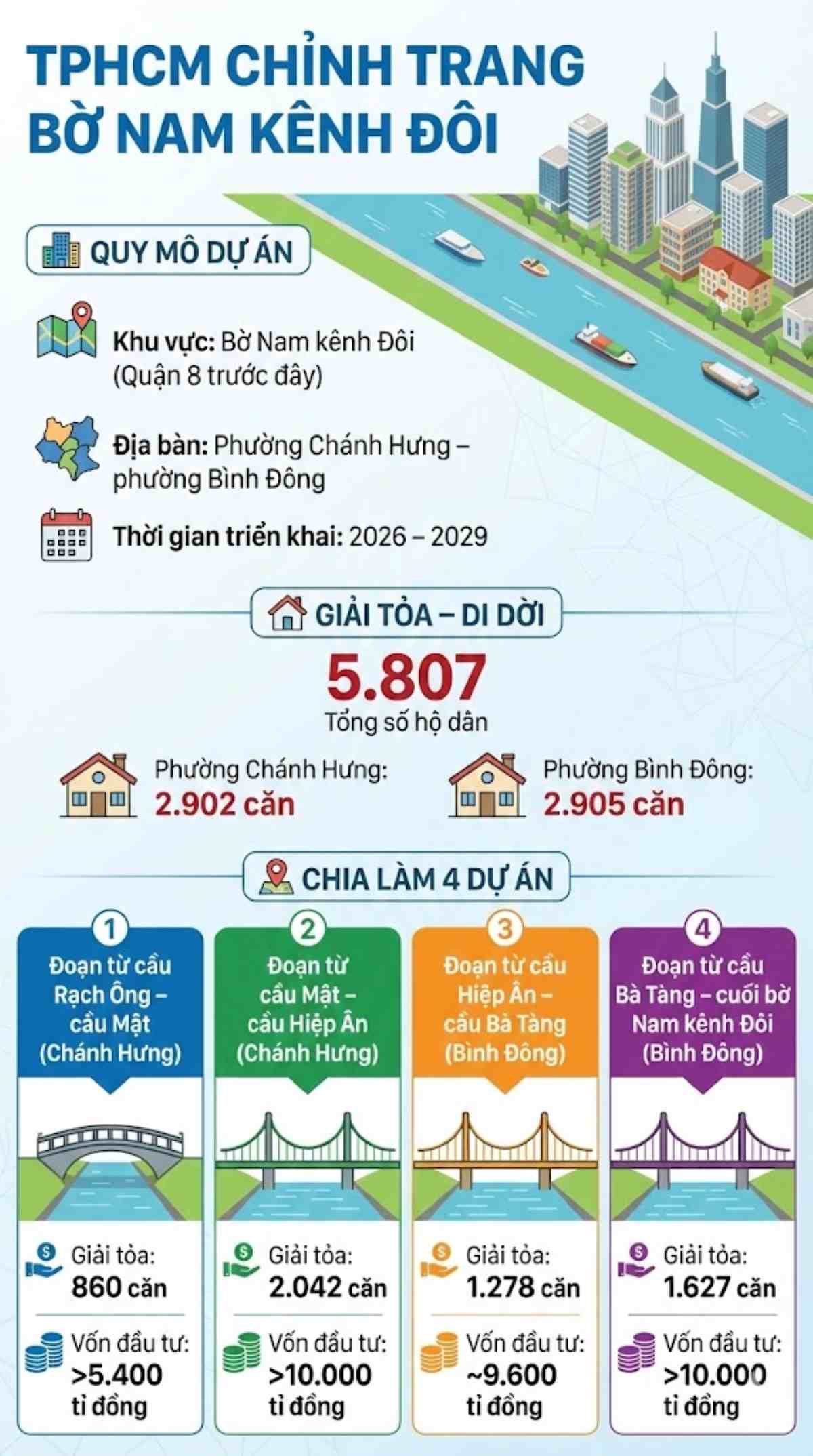On December 28, the Ho Chi Minh City Department of Construction said that the Ho Chi Minh City People's Committee has assigned the Ho Chi Minh City Urban Infrastructure Construction Investment Project Management Board to prepare a pre-feasibility study report for urban embellishment projects along the South bank of the Doi canal (formerly District 8 area).