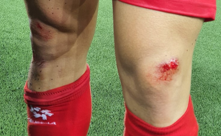 Vietnamese football player's leg bleeds while playing on artificial turf