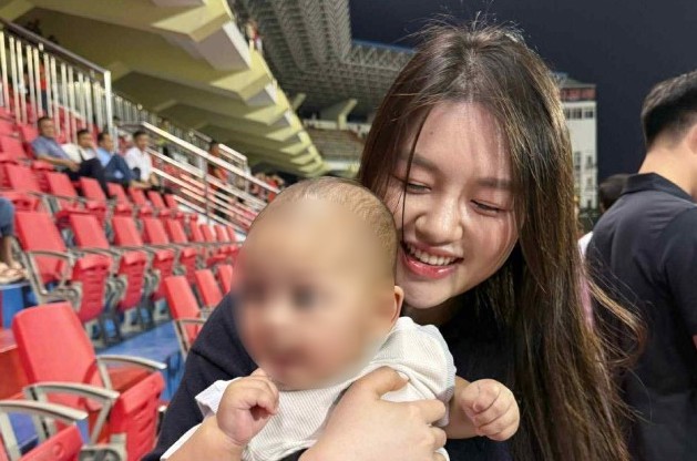 The female president of Ninh Binh club smiled and cared while holding the son of goalkeeper Van Lam, on the day the home team won 2-0 against Nam Dinh.