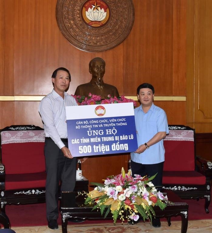 Bộ Thông tin và Truyền thông đã trao 500 triệu đồng do cán bộ, công nhân viên chức, lao động Bộ Thông tin và Truyền thông quyên góp cho Uỷ ban Trung ương Mặt trận Tổ quốc Việt Nam (MTTQVN) để ủng hộ đồng bào các tỉnh miền Trung khắc phục thiệt hại do bão lụt gây ra.
