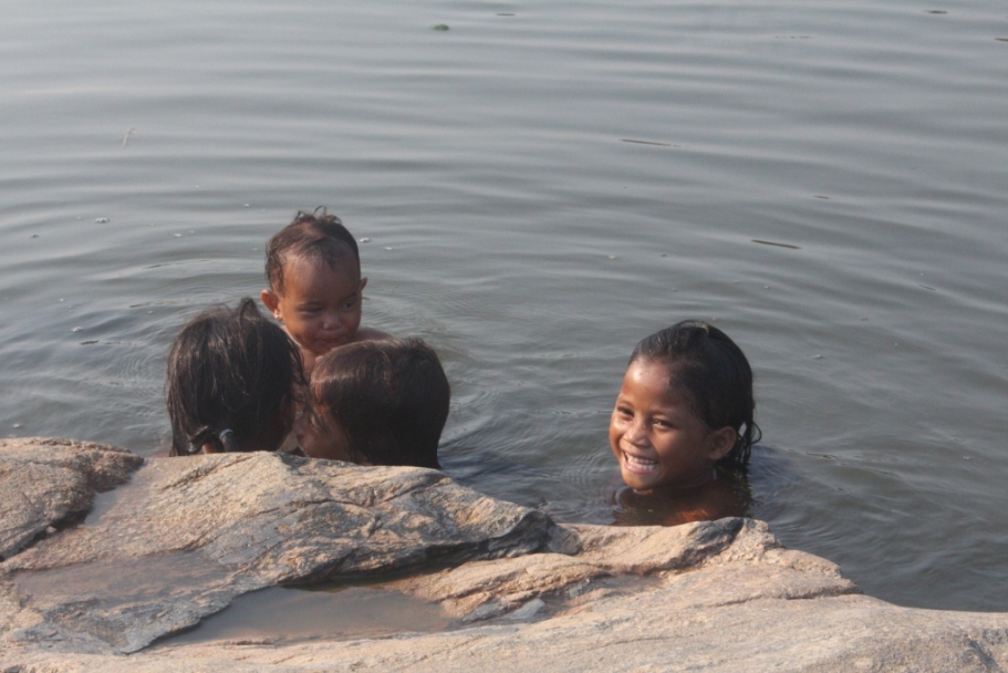 | Trẻ em phải tắm trên những vũng nước đọng, bẩn thỉu, nền văn minh sông nước bị xóa sổ. Ảnh: Đình Văn |
