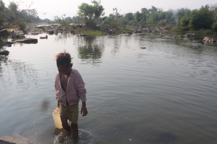 | Trẻ nhỏ giúp bố mẹ, gạn nước mang về sinh hoạt. Ảnh: Đình Văn |