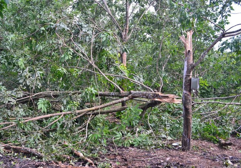 | Cây caosu bị gãy do ảnh hưởng của bão số 4, nhưng may mắn thiệt hại không nhiều và phân bố rải rác chứ không tập trung. Ảnh: TH. |