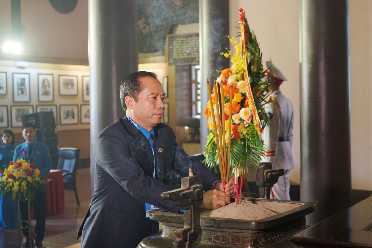 At the memorial site, the leaders of the Thanh Hoa Provincial Federation of Labor and the delegates respectfully paid their respects and expressed their deep gratitude for President Ho Chi Minh's great contributions and selfless sacrifices for the people and the country.