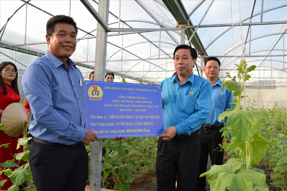 Nằm trong chuỗi hoạt động tại huyện đảo Phú Quốc, chiều ngày 24.7, Chủ tịch LĐLĐ Kiên Giang Trần Thanh Việt đã đến gắn biển chào mừng 90 năm Ngày thành lập CĐVN cho công trình “Vườn rau Công đoàn” của Công đoàn bộ phận (CĐBP) Trường Trung cấp Việt – Hàn (CĐCS Sở LĐTBXH).